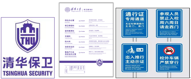 保衛(wèi)處在美術(shù)學(xué)院支持下,設(shè)計完成并啟用“清華保衛(wèi)”視覺識別系統(tǒng)(Visual Identity,簡稱VI),其中包括基礎(chǔ)和應(yīng)用兩大部分。核心標(biāo)識融合了清華元素和安保工作的特色和理念,并在此基礎(chǔ)上產(chǎn)生一系列應(yīng)用,均實現(xiàn)中英雙語。以“清華保衛(wèi)”的圖形標(biāo)識為例,這一標(biāo)識由“二校門”剪影,清華大學(xué)英文縮寫字母“THU”以及象征保衛(wèi)、安全的盾牌組成,既體現(xiàn)了清華大學(xué)深厚的底蘊,也展現(xiàn)了清華大學(xué)的國際化形象。保安人員的背貼由“清華保衛(wèi)”及其英文“TsinghuaSecurity”組成,可以幫助學(xué)生更方便地識別保安人員,在有需要時及時求助。在日常校園安全管理當(dāng)中,校內(nèi)交通標(biāo)識標(biāo)牌等設(shè)施、設(shè)備雙語化程度現(xiàn)已達到90%及以上,為國際學(xué)生的生活帶來了較大便利,也展示了國際化的校園安全形象。